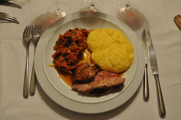 Main course / épaule d’agneau rôtie frottée au thym et au piment d’Espelette + ratatouille et polenta + Côtes du Rhône Fonsalette 2000 Syrah + Châteauneuf-du-Pape Mont-Olivet 2000 Papet + Châteauneuf-du-Pape Ferrand 2000